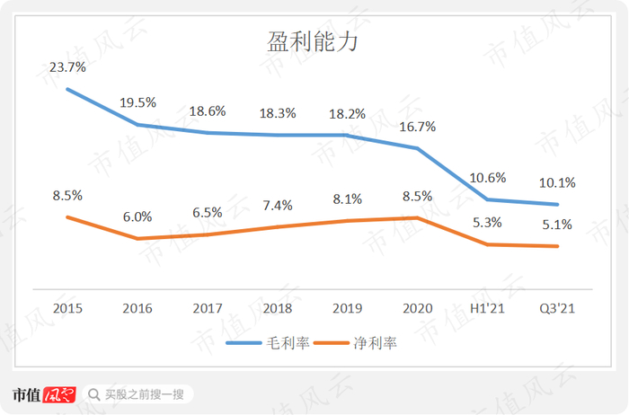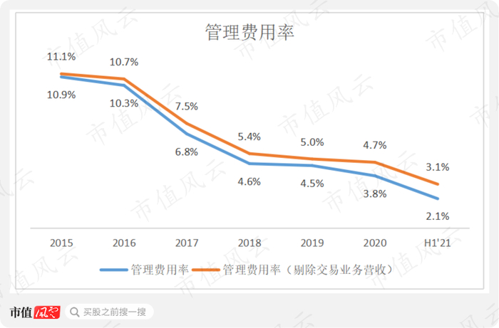 2015年以来,公司的管理费用率不断降低,由10.9%下降至2021年上半年的2.1%,即使剔除交易业务的营收影响,管理费用率依旧呈现下降趋势,由11.1%下降至了3.1%,已经显现出规模优势。