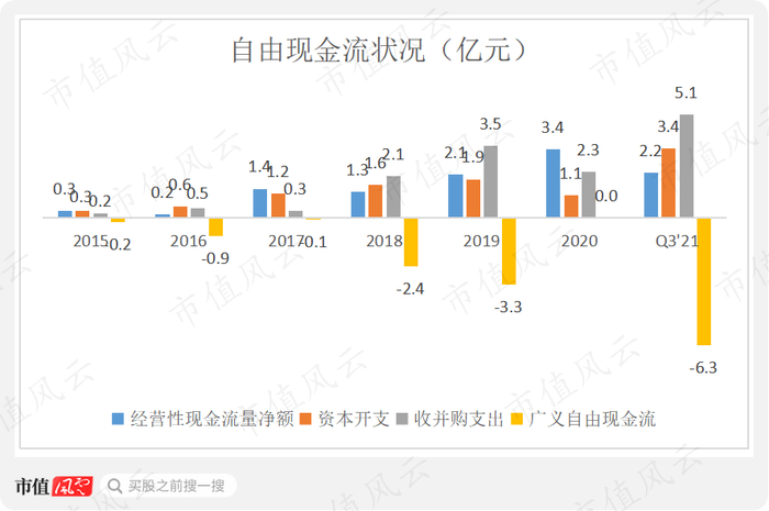 但由于持续的自建和并购,公司资本开支及收并购支出也一直较大,导致各年自由现金流一直为负,2018年上市以来自由现金流已累计达-12亿。