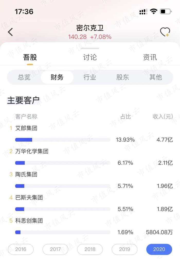经过20多年的发展,公司的客户已涵盖包括巴斯夫集团、陶氏集团、阿克苏集团、PPG工业、佐敦集团、阿科玛集团、万华化学等全球知名的跨国化工企业,2020年前五大客户占比为33%。
