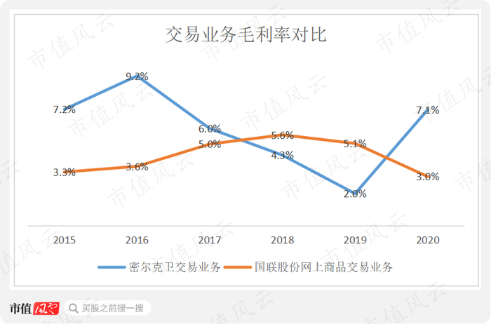 对比两者交易业务的毛利率,国联股份由于涉及行业较多,周期性不明显,毛利率较稳定,在3%-6%之间。
