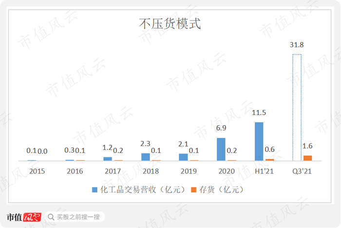 2021年起,公司化工品交易业务营收增长迅速,以跨期结算为主的存货规模也有了较大增加,由2020年的0.2亿增长为2021年上半年的0.6亿以及2021年前三季度的1.6亿,但与交易规模相比比例仍非常低。