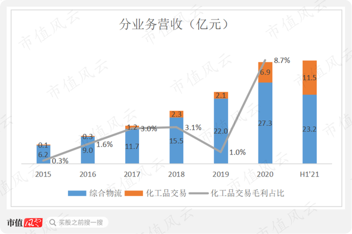 分业务来看,2019年之前公司业绩增长主要依赖综合物流板块,2020年化工品交易板块开始放量,营收达到6.9亿,是2019年的3倍多,2021年上半年达到11.5亿,是2020年全年的1.7倍。
