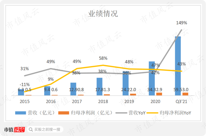 2021年三季度数据更加亮眼,营收和归母净利润分别达到59.5亿和3.0亿,分别同比大增149%和43%,且均超过2020年全年。
