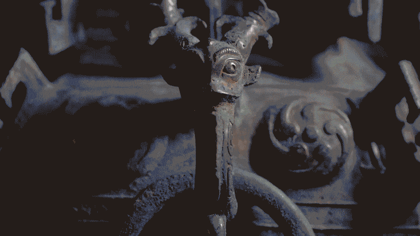 其二,更引人瞩目的是青铜器上的神秘纹饰。方罍和卣上的兽面几乎涵盖了商周时期所有常见的动物形象,如夔龙、凤鸟、饕餮、蛇等。最为特殊的是青铜器上的主体高浮雕兽面纹,细看会发现它更近似于一张人脸:其眼睑、眼眶、眼球及瞳孔的结构层次分明,眼睛上方有用一条条竖线组成的弯弯眉毛,还特别塑造出两翼圆厚的鼻子。这便是噩国青铜器上独有的“神面纹”了。卣的两面共有14张“人面”,罍的四周共有13张“人面”。它们个个精致独特,甚至还略带笑颜。而且由于当地地质、水分等特殊的埋藏条件,这批青铜器的表面形成了罕见的蓝色锈,瑰丽奇异,动人心魄。