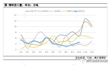 进口方面,根据海关数据,2021年10月,中国进口精炼锌4.1万吨,同比减少36.32%,1-10月累计进口40.27万吨,累计同比由上月的增加转为降低4.63%。年中以来,精炼锌进口持续处于亏损状态,且亏损幅度走阔,精锌进口窗口关闭。这背后的原因在于,中国经济从疫情中恢复的节奏要领先海外,目前国内已度过快速恢复阶段,而海外恢复势头还正盛,因此沪伦比处于低位,不利于进口,这种局面料还将延续一段时间。明年随着海外经济恢复势头放缓,国内上半年锌需求缓缓回暖,沪伦比有望上修,进口亏损缩窄或是打开进口窗口,预计明年精锌进口或有7万吨左右的增量。