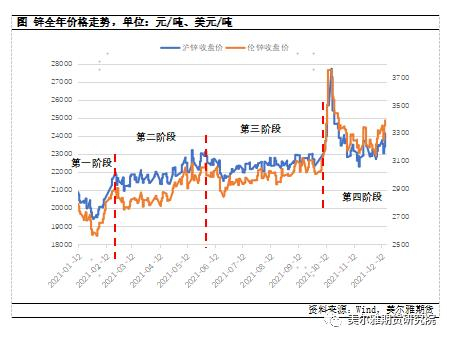 截止2021年12月18日,沪锌收盘报价23805元/吨,年内上涨2970元/吨,涨幅14.25%。伦锌收盘报价3381美元/吨,年内上涨630美元/吨,涨幅22.90%。可将锌整个2021年的价格行情走势大致划分为四个大的阶段。