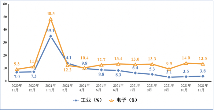 图3  2020年1-11月份以来电子信息制造业固定资产投资增速变动情况图3  2020年1-11月份以来电子信息制造业固定资产投资增速变动情况