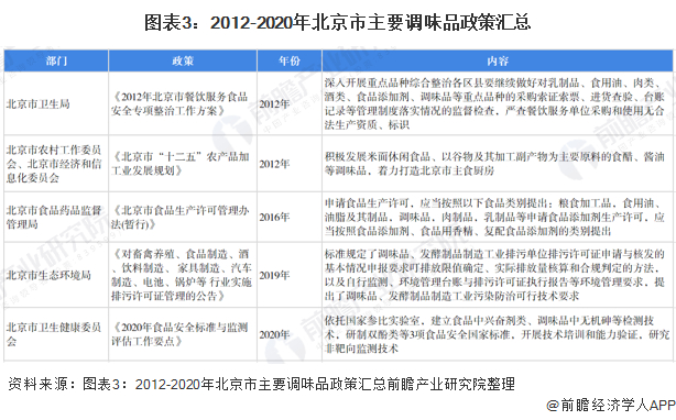 随着调味品的市场需求逐渐增加,北京市卫生局、北京市食品药品监督管理局和北京市卫健委均出台政策来规范调味品的发展。近年来北京市主要调味品政策如下图所示:
