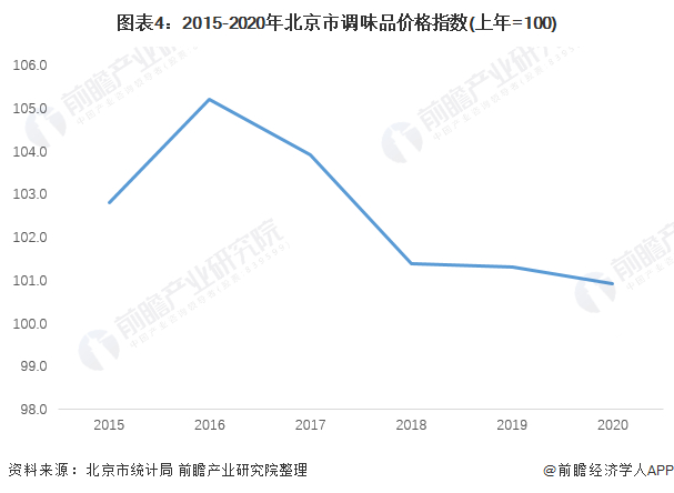 根据北京市统计局披露的数据,北京市调味品物价指数呈稳定下降趋势,在2016年调味品价格指数达到顶峰之后,开始逐渐下降,2020年价格指数下降至近年来最低。尽管如此,2015-2020年北京市调味品价格指数均在100以上,其调味品价格仍在逐年上涨。