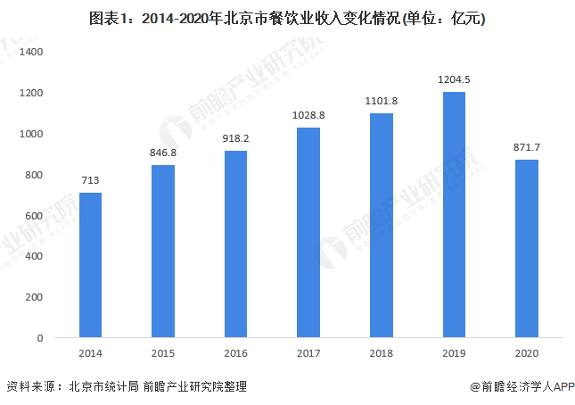 作为我国首都,2020年,北京常住人口为2189.3万人,全年全市居民人均可支配收入为69434元,比上年增长2.5%,较大基数的人口和消费水平带动了北京市餐饮行业规模的不断增长。根据北京市统计局统计数据,2014-2019年北京市餐饮业收入整体呈增长趋势。2020年,受疫情影响,北京市餐饮业收入有所下降,为871.7亿元。