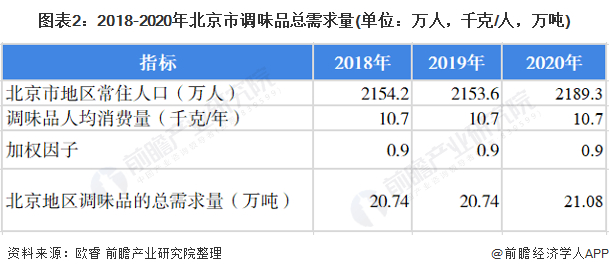 北京市餐饮业规模的不断扩大也带动了北京市调味品市场的需求,根据北京市常住人口、以及2020年调味品人均消费量和调节人均消费不均衡的加权因子测算,2018、2019年北京地区调味品总需求量为20.74万吨,2020年北京地区调味品总需求量为21.08万吨。