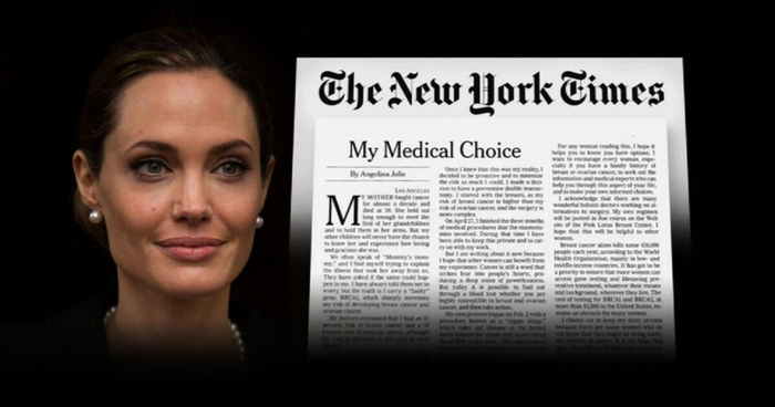 ▲ 2013年5月,安吉丽娜•朱莉通过《纽约时报》发表公开信,宣布自己为了降低患乳腺癌的风险,已经切除双乳乳腺,并进行乳房重塑。