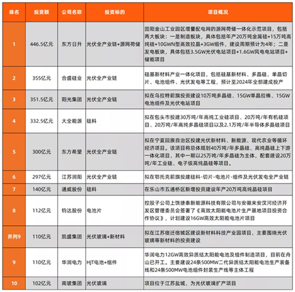 但就是这样一位发电侧的央企“大佬”,如今也亲自下场做起了光伏制造。2021年以一笔110亿的异质结项目投资,站上年度“最豪横”扩产榜单十强: