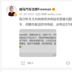 “每次听车主向我抱怨充电桩安装难问题,心情都很沉重。2021年,威马交付了4万多辆汽车,但随车配送的充电桩却有近2万根送不出去。”威马汽车创始人、董事长兼CEO沈晖在自己的微博上表达了无奈。