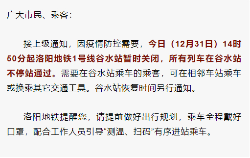 接上级通知,因疫情防控需要,今日(12月31日)14时50分起洛阳地铁1号线谷水站暂时关闭,所有列车在谷水站不停站通过。需要在谷水站乘车的乘客,可在相邻车站乘车或换乘其他交通工具。谷水站恢复时间另行通知。