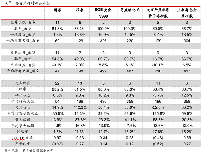 从择时效果来看,豆粕的看空信号准确性较差,其余资产的择时系统胜率均较高,且相对于各自的指数具有一定的超额收益,因此我们在在使用时,豆粕仅使用看多观点的信号。