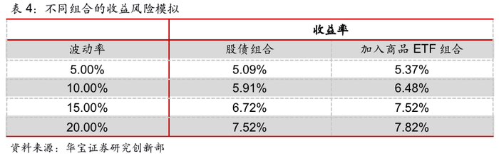 我们举几个例子来说明上图有效前沿模拟的波动率与收益率的组合。当组合承担5%的年化波动风险时,股债组合的最优年化收益为5.09%,加入商品ETF组合收益为5.37%,随着商品ETF的加入,组合收益也有所增加。同样的,当组合的波动风险为10%、15%以及20%时,组合最优收益也呈现相同的规律。也即随着商品ETF的加入,同等风险条件下的收益是在不断提升的,这也意味着同等收益条件下,风险是在降低的,说明将商品ETF加入配置是有意义的。