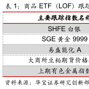 目前商品型ETF覆盖的商品种类包括黄金、白银、能源化工、豆粕和有色金属共5类。其中黄金ETF跟踪的是现货指数,其余商品ETF跟踪的均为期货指数。黄金ETF的数量最多,白银仅有一只LOF,其余能源化工、豆粕与有色金属各有一只ETF产品。