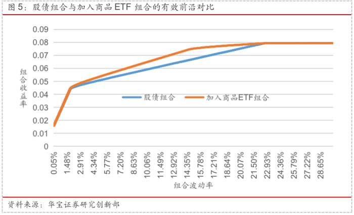 为了验证在做资产配置时将商品ETF纳入的有效性,我们分别对比了仅有股债资产和加入商品ETF资产两种资产组合有效前沿的区别。