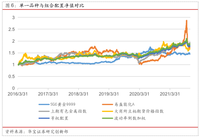 前文测试中我们发现加入商品的配置可以改善有效前沿,那么在配置时是仅加入一种商品还是将多品种商品做配置后再融入综合配置中呢?这里我们对比了单一商品的收益风险情况与几种商品等权配置,以及通过波动率倒数进行加权后的配置结果。由于波动率倒数我们需要过去3年的数据来计算商品的波动率,因此测试开始时间统一为2016年。