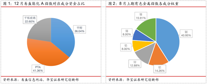 跟踪能源化工期货指数的基金也仅有建信易盛郑商所能源化工期货ETF,该基金成立于2019年12月,当前规模合计2.98亿,杠杆率113.19%,资产配置上30%用于买入反售证券,银行存款55.89%,另有19.52%的其他资产主要用于期货保证金。该基金跟踪的易盛能源A,12月最新一期成分包括三类,分别是PTA、甲醇与平板玻璃。