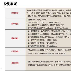 估值上,材料猪八戒网2016年预计收入27.5亿元、净利润8.5亿元,给予11.8倍投前PE,投前估值100亿元。“本轮投资人以投前估值100亿元的价格对目标公司增资人民币10亿元。”退出安排则显示,猪八戒网计划在两年内独立IPO,预计2017年净利润可达到12.75亿元,“如果公司成功上市,按23倍市盈率预测,公司上市时估值可以达到293.25亿元。上市后可望达到100倍PE,市值1275亿元,锁定期为1年”。