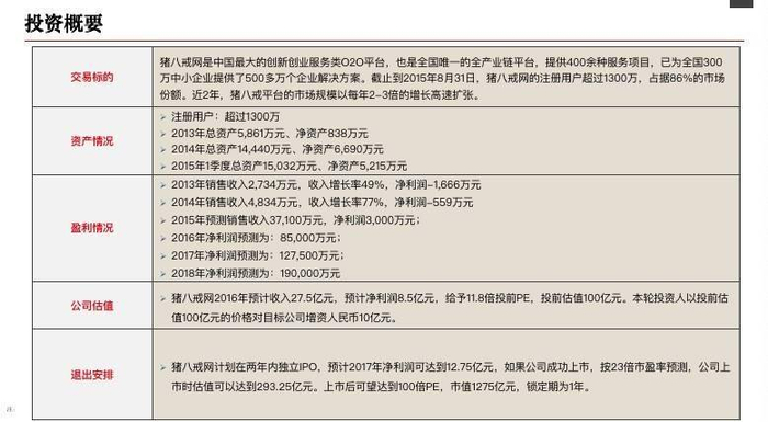 一方面,打动他的当然是投资标的本身的资质。根据推介材料的介绍,猪八戒网是“中国最大的创新创业服务类O2O平台”,也是“全国唯一的全产业链平台”。截至2015年8月31日注册用户超过1300万,占据86%的市场份额。近两年,猪八戒平台的市场规模以每年2~3倍的增长高速扩张。
