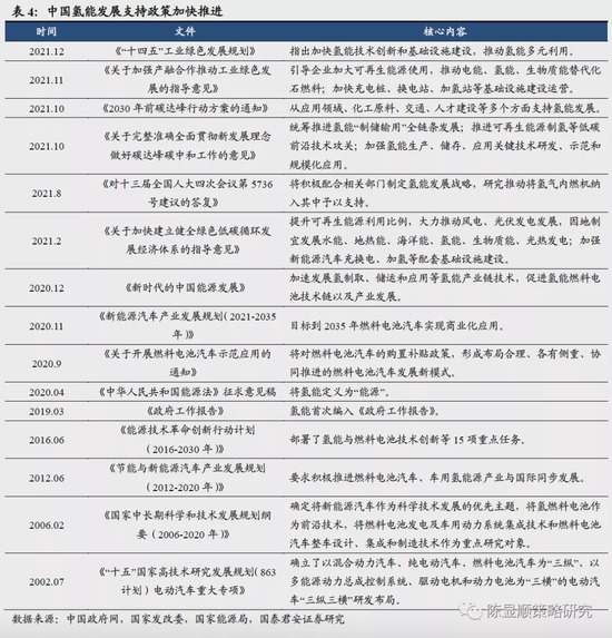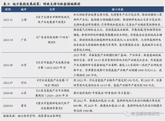 国家燃料电池城市群政策推出实施。2020年9月16日,财政部、工信部、科技部和发改委、国家能源局五部门发布《关于开展燃料电池汽车示范应用的通知(财建〔2020〕394号)》,对燃料电池汽车的购置补贴政策,调整为燃料电池汽车示范应用支持政策,对符合条件的城市群开展燃料电池汽车关键核心技术产业化攻关和示范应用给予奖励,形成布局合理、各有侧重、协同推进的燃料电池汽车发展新模式。2021年8月31日,京津冀、上海、广东为代表的中国首批燃料电池汽车示范城市群率先获批。中国独特的城市群发展模式,在内部信息共享交流、地方政府扶持等方面更有利于氢能领域的发展。