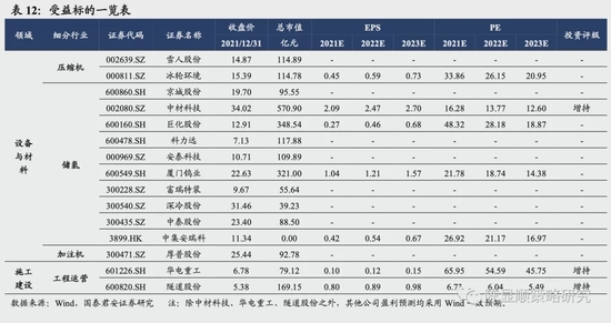 看好加氢站核心装备提供商。具体来看,涉及加氢站建设、设计、运营等环节,主要公司包括:华电重工、隧道股份。