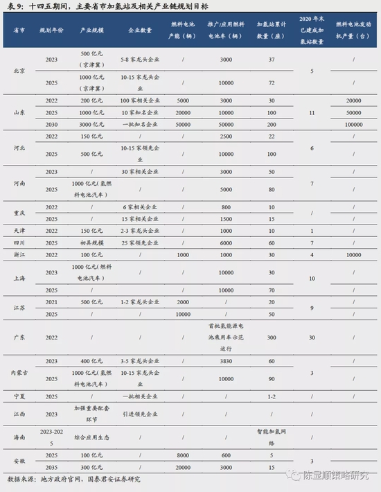 地方政策目标规划积极跟进,助力产业链标准体系建设。省域地区也陆续推出了促进氢能发展的政策文件。据不完全统计,已有北京、河北、广东、山东、浙江、北京、上海、重庆等多个省市在其“十四五”规划中明确提出要发展氢能产业。
