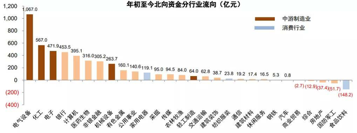 图表:今年北向资金主要买入中游制造业、流出食品饮料