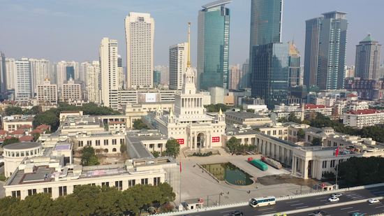 市民驻足欣赏上海展览中心 陈伊萍 摄