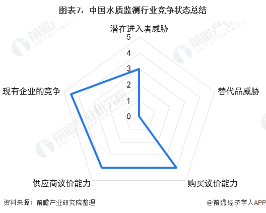 从五力竞争模型角度分析,目前,我国水质监测市场的竞争者数量适中,但产品多处于中低端水平,产品同质化严重,现有企业间的竞争较为激烈;而水质监测仪器设备服务是环保产业基础,不存在替代品威胁;水质监测行业的上游大部分为零部件企业,我国水质监测产品同质化明显,关键材料、核心部件、嵌入式计算机、操作系统等虽取得重要进展,但仍有部分核心部件(如硬件传感器等)以及高端仪器依赖进口,供应商议价能力较强;下游消费市场主要是终端客户,同样由于产品同质化严重,消费者的选择较多,因此由较强的议价能力;此外,环境监测仪器行业虽然具有一定的技术壁垒,但由于市场保持着稳定增长趋势,国家对于环保产业扶持力度加大,行业具有较强的吸引力,因此面临着一定的新进入者威胁。