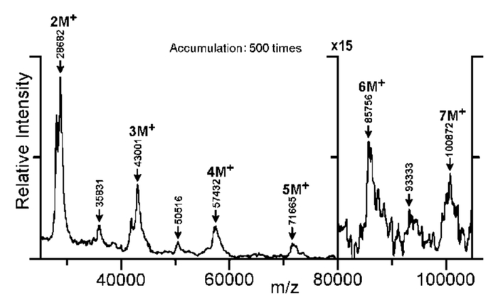 我们不难想象当年田中在经历了无数失败的实验后终于取得成功的狂喜,但他具有阿甘那样无比的韧性,依然毫不松懈地乘胜追击,又于1987年检测到分子量高达100872道尔顿的溶菌酶(lysozyme)七聚体(图7)。
