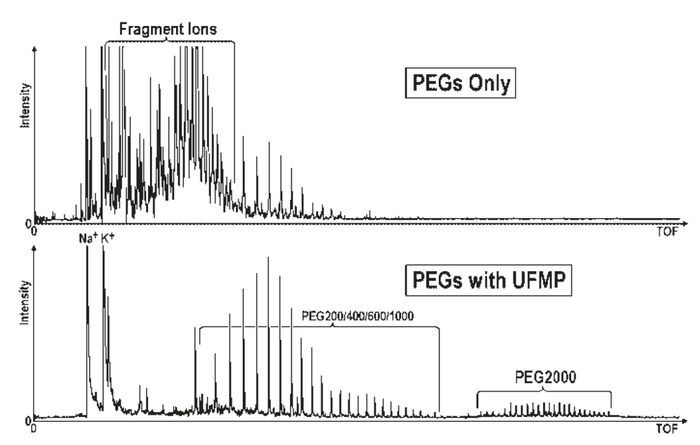 田中运用UFMP为介质取得了一个阶段性成果,他成功地提升了有机高分子的质谱检测范围,例如聚乙烯二醇(PEG)系列混合物,单独被激光照射离子化后在质谱上只能看到1000道尔顿以下的多聚体,并且不同分子量的离子峰间分辨率较差。而PEG与UFMP介质混合后的激光照射质谱能够清晰地检测到2000道尔顿系列,同时200、400、600、1000、2000系列的峰间分辨率全面升高(图2),实验结果令人鼓舞。可惜UFMP介质用于分子量上万的生物高分子的离子化仍然收效甚微。
