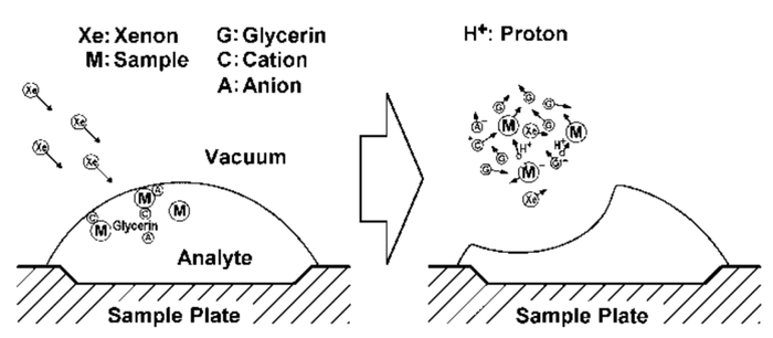 好奇的读者难免要问,当时田中的实验桌上为何会放着一瓶甘油?原来1980年代初的质谱界最流行的离子化手段还不是激光照射,而是由巴伯(Michael Barber)和瑟曼(David Surman)等人首创的快原子轰击法(fast atom bombardment, FAB),这种方法需要用甘油为介质(图3)。岛津研究小组要研制新型质谱仪就免不了要用FAB方法做对照实验,这样才能证明新方法的优越性。