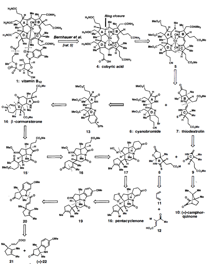 图5:根据反合成分析法设计的维生素B12全合成路线。来源:Nicolaou, K.C. & Sorensen, E.J. (1996) Classics in Total Synthesis, pp. 99-136, VCH Publishers, Inc.