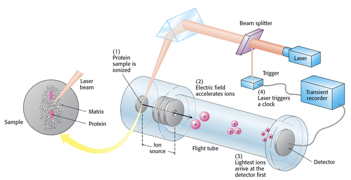 图11:现代介质辅助激光去吸附离子化质谱仪的工作流程。来源:Berg, J.M., Tymoczko, J.L., Gatto, G.J. & Stryer, L. (2015) Biochemistry, 8th Edition, W.H. Freeman & Company.