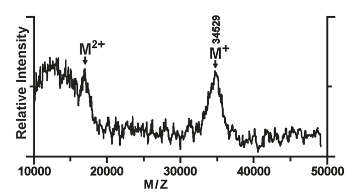 凭着对实验细节不厌其烦的重视,田中终于在1985年8月检测到了34529道尔顿的羧肽酶(carboxypeptidase A)的分子离子峰(图6)。这是仪器分析化学的一个历史性突破,正式宣告蛋白质大分子可以被完整地离子化而进入气相。