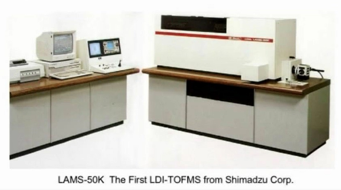 而田中的方法基本上无人问津,岛津的第一代MALDI质谱仪“LAMS-50K”在十多年里只卖出可怜的一台(图12)。但德国团队由于早在1987年9月就收到了科特的传真,亲眼看到了田中等人成功检测分子量高达10万的蛋白多聚体质谱,基于学术规范他们必须在论文的参考文献里征引田中的会议摘要(他们投稿时田中的正式论文尚未付印)。