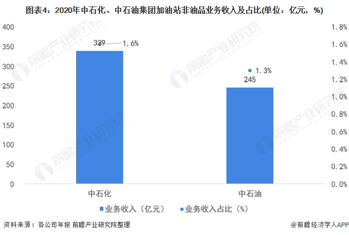 从中石油、中石化年报数据来看,2020年分别实现非油品业务收入339亿元及245亿元,分别占企业年营收的1.6%和1.3%。由此可见加油站非油品业务的收入仍处于较低水平,收益有待提高。