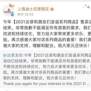 12月29日晚8点多,上海迪士尼度假区官方微博发消息称,“2021年【2021达菲和朋友们圣诞系列商品】售卖活动已经结束”。