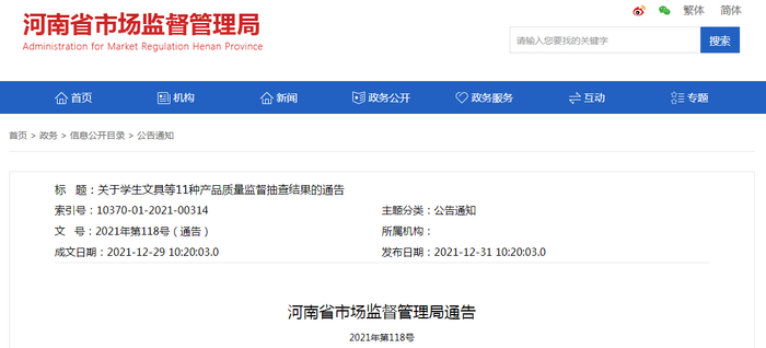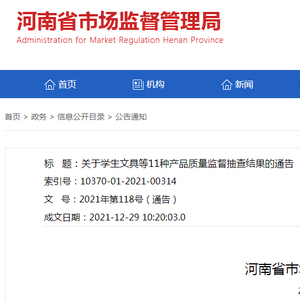 河南省市场监管局关于学生文具等11种产品质量监督抽查结果的通告(2021年第118号)