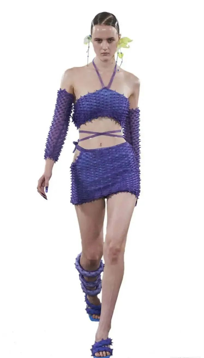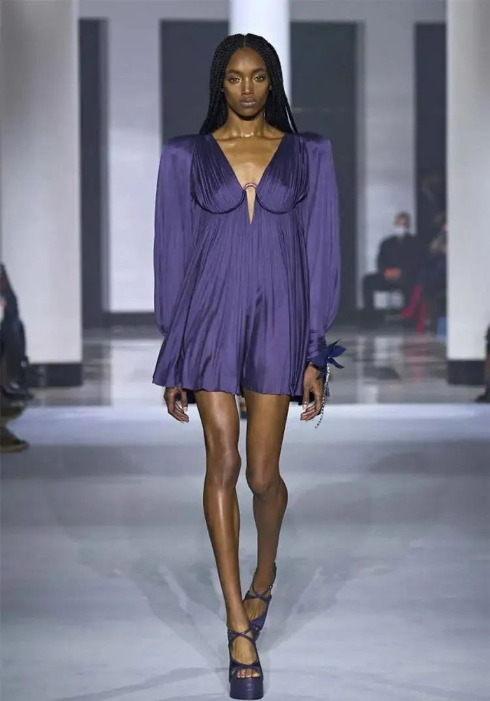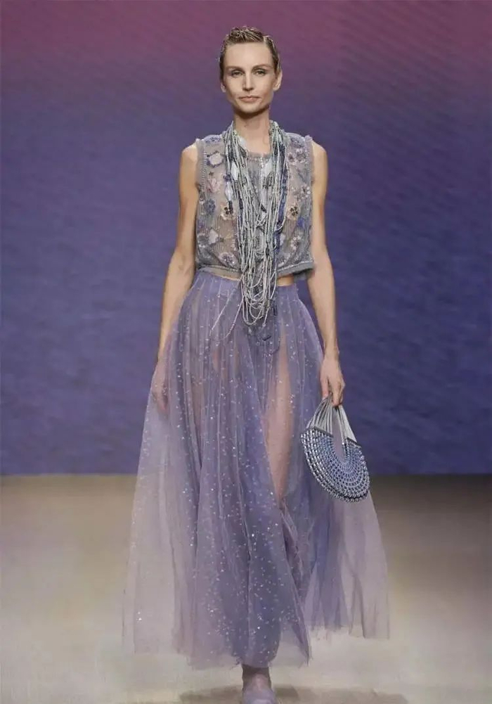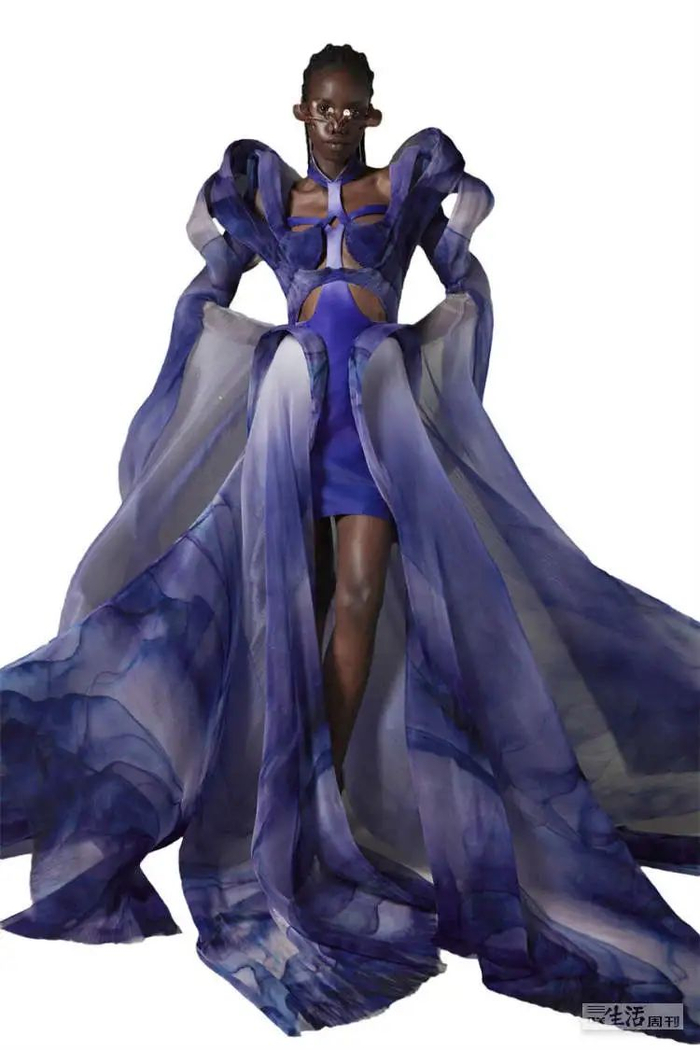 在2022的T台上,这种蓝中带紫的色调被揉进了Saint Laurent女郎的帅与酷中,略带棱角的线条中和了紫色浪漫的氛围感;Lady Gaga亮相《古驰家族》的全球首映礼和安雅·泰勒-乔伊出席美国时装设计师协会(CFDA)时尚大奖时也穿了同色系的“战袍”;GiorgioArmani在2022春夏系列的蓝紫色纱裙中点缀了银色的“繁星点点”,不愧是与Armani Privé 2016年春夏高定的轻盈曼妙系出同门,坚守着老牌时装屋的华贵。维吉尔·阿布洛为路易威登男装设计的最终系列也不乏这种代表着过渡与中间地带的颜色。