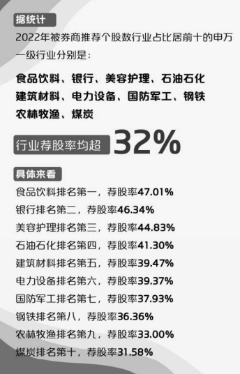 据此统计,2022年被券商推荐个股数行业占比居前十的申万一级行业分别是:食品饮料、银行、美容护理、石油石化、建筑材料、电力设备、国防军工、钢铁、农林牧渔、煤炭,行业荐股率均超32%。显然,券商金股“网”撒得较宽。