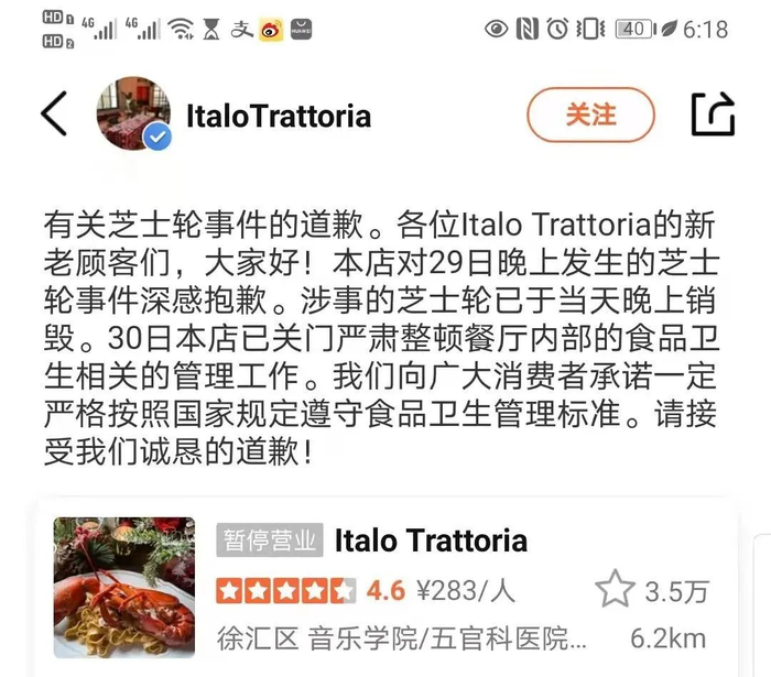 “Italo Trattoria”餐厅持有有效营业执照及食品经营许可证,名称:上海意大罗餐饮管理有限公司。经查,在该店现场未查见涉事“车轮芝士”,该店负责人表示已将该芝士销毁,并停业自查。该局已对该店涉嫌违反《食品安全法》的相关行为立案调查。