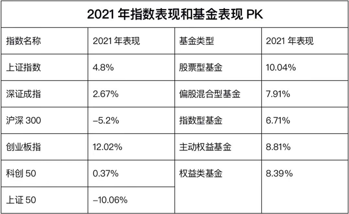 基金业绩方面,虽然2021年与前两年基金大年相比逊色不少,但股票型基金平均收益超10%、主动权益类基金平均收益8.81%,均跑赢了同期大盘和沪深300,再次很好诠释了“炒股不如买基”的理念。