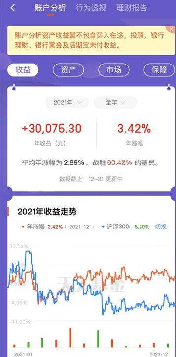 2021年老司基的基金账户总收益为3.42%,虽然跑赢了沪深300指数8个点,但这个收益率只能算很一般,仅比货币基金高出一丢丢。勉强跑赢60%基民,给个及格分60分。