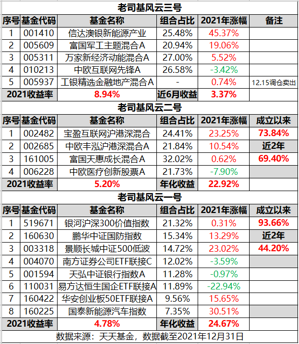 老司基的三个基金组合,全年调仓换基频次很低,大部分时间就是选择定投并持有。风云一号和风云二号全年没有任何持仓基金变动,风云三号仅有年底一次调仓换基,卖出了与风云三号主打科技风格不符的005937工银精选金融地产混合A。