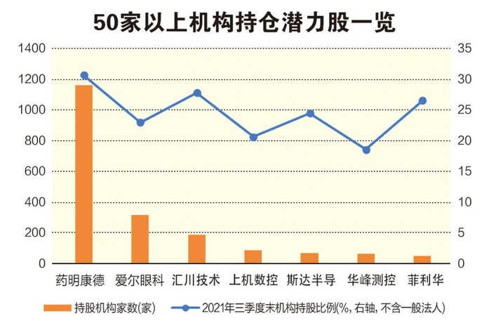 在不俗业绩支撑下,二十大潜力股备受社保、QFII、券商、基金等机构资金青睐。2021年三季报显示,二十大潜力股共获2300家左右的机构持股,爱尔眼科等7只个股获得50家以上机构持股,斯达半导、爱尔眼科获2家以上QFII持股。